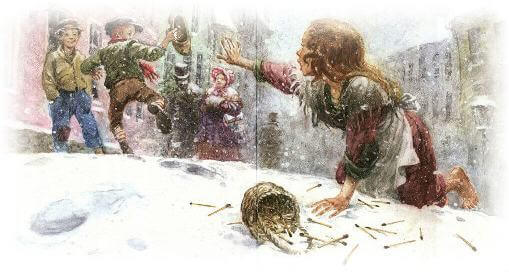 Она замёрзла в последний вечер старого года; новогоднее солнце осветило маленький труп. Девочка сидела со спичками; одна пачка почти совсем обгорела.
